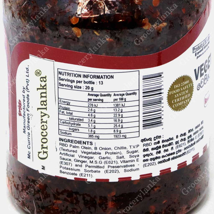 Spice up your meals with Mc Currie Vegetarian Chinese Chili Paste 275g (9.7oz). This flavorful condiment combines chilies, spices, and seasonings to create a fiery, savory paste that perfectly complements Asian and Sri Lankan dishes. A versatile vegetarian-friendly paste that brings heat and depth to your everyday cooking.